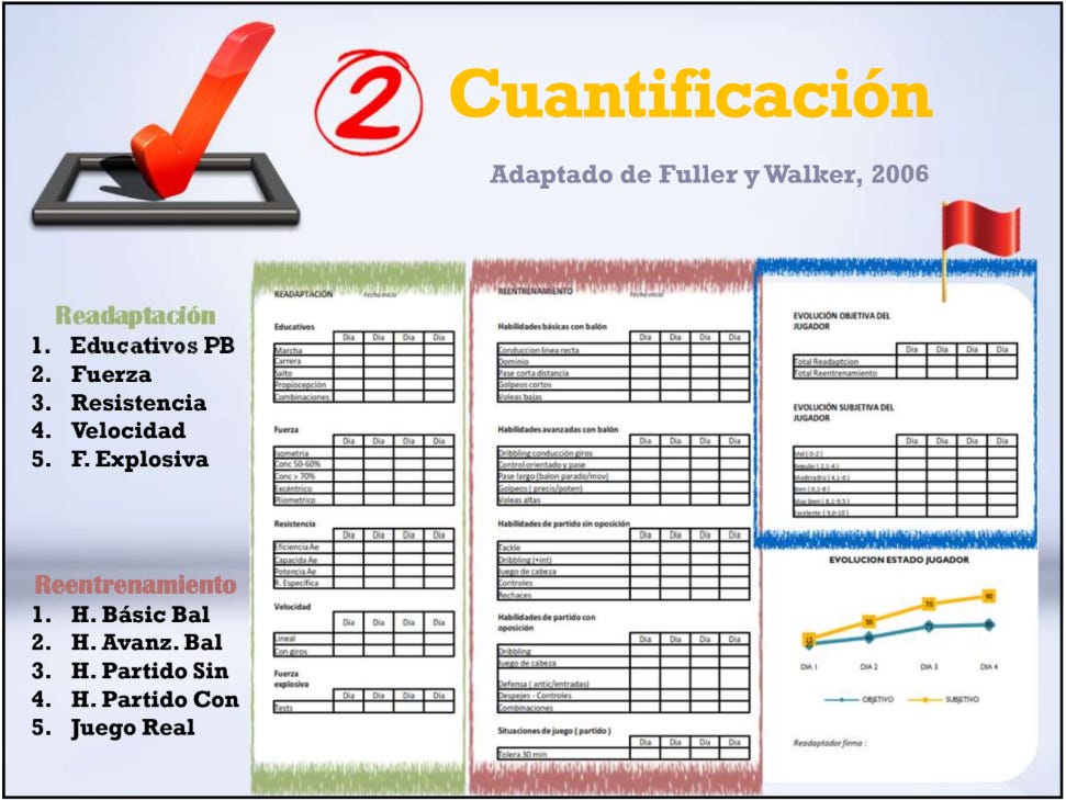 Fuller nos habla de 5 bloques a trabajar y a cuantificar en la readaptación (educativos, fuerza, resistencia, velocidad y fuerza “explosiva”) y otros 5 bloques a trabajar en reentrenamiento (habilidades básicas con balón, avanzadas, habilidades de partido sin oposición, con oposición y juego real).