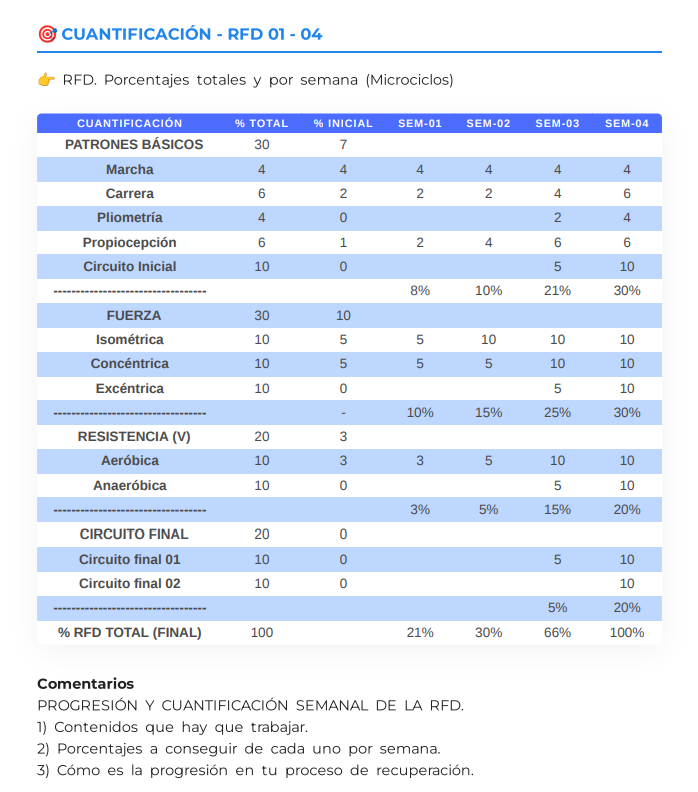 El % total te lo da el tipo de lesión (ejemplo, si es una lesión muscular grado 2 ya sabes que serán 4 semanas aproximadamente), el % inicial es muy fácil de calcular, pero la progresión de contenidos y su carga de entrenamiento semanal es imprescindible dominarla bien.