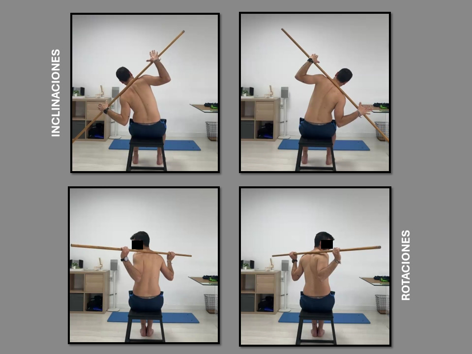 Ahora le pedimos a la persona que se siente en un taburete o similar para poder ver los movimientos de la columna y le colocamos una pica sobre los hombros. Nos colocamos detrás y le pedimos: